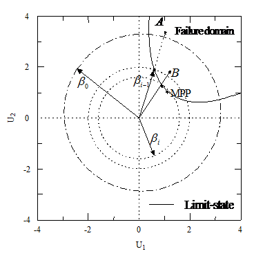 次迭代的超球外的失效樣本點(diǎn),如圖4.1中的A、B點(diǎn),分別求其概率密度函數(shù),選取其中概率密度函數(shù)最大的樣本點(diǎn),在其與坐標(biāo)原點(diǎn)的連線方向上進(jìn)行線性搜索,由于是內(nèi)插搜索,因此一般經(jīng)過2到3次搜索,即可確定該連線與極限狀態(tài)的近似交點(diǎn),交點(diǎn)到原點(diǎn)的距離即為新的超球半徑