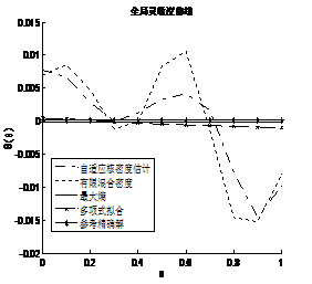 對(duì)于此工程算例,利用900個(gè)失效樣本點(diǎn)擬合概率密度函數(shù)和全局靈敏度。由圖8.7可以看出基于有限混合密度和自適應(yīng)核密度估計(jì)方法得到的失效概率函數(shù)曲線波動(dòng)較大,其他兩種方法雖也有較大誤差,但與參考精確解的曲線的趨勢(shì)較為貼近。由圖8.8可以看出基于最大熵密度估計(jì)法與正交多項(xiàng)式擬合概率密度法所得的全局靈敏度曲線與參考精確解的曲線相差不大,而基于有限混合密度法與自適應(yīng)核密度估計(jì)法得到的全局靈敏度仍然波動(dòng)較大。