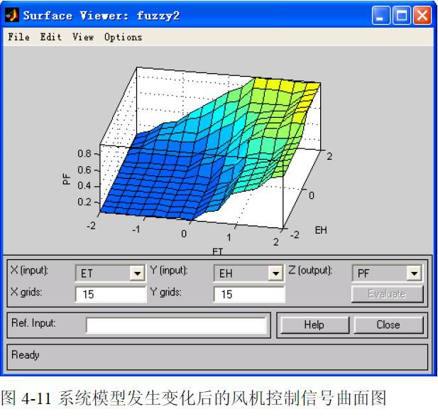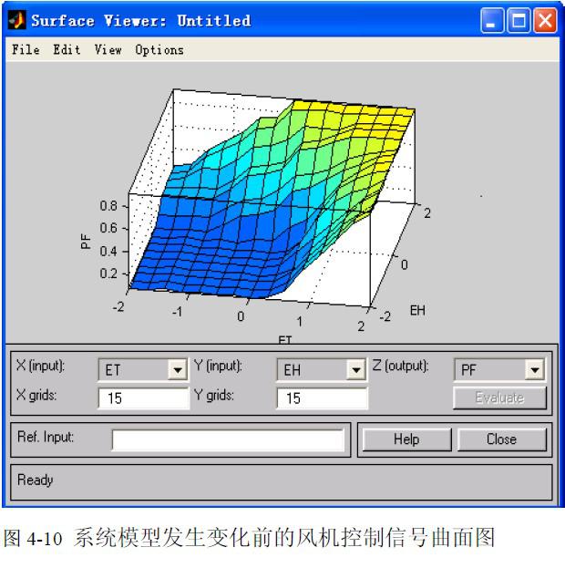 從仿真曲面圖中可以清楚的看到,當(dāng)系統(tǒng)模型發(fā)生變化時(shí),風(fēng)機(jī)的控制策略也隨著發(fā)生變化,體現(xiàn)了系統(tǒng)的智能性和自適應(yīng)性。