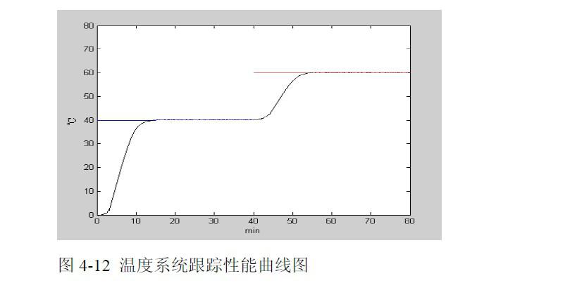 輸出變量經(jīng)過(guò)模糊判決后輸出的控制量在0—1 之間,表示各個(gè)執(zhí)行器的運(yùn)行功率與運(yùn)行功率的比值。采用對(duì)數(shù)型激活函數(shù)而沒(méi)有用模糊神經(jīng)網(wǎng)絡(luò)的輸出直接作為最終輸出的目的是為了讓執(zhí)行器能夠平滑過(guò)渡,減少磨損,延長(zhǎng)使用壽命。環(huán)境試驗(yàn)箱溫度系統(tǒng)仿真結(jié)果環(huán)境實(shí)驗(yàn)箱在初始時(shí)刻設(shè)定跟蹤溫度為 40℃。在40 分鐘后設(shè)定為60℃。,誤差在2℃以外采用強(qiáng)制加熱或強(qiáng)制冷卻,在距離跟蹤目標(biāo)的誤差在2℃以內(nèi)啟動(dòng)模糊控制策略,系統(tǒng)動(dòng)態(tài)跟蹤性能如圖所示: